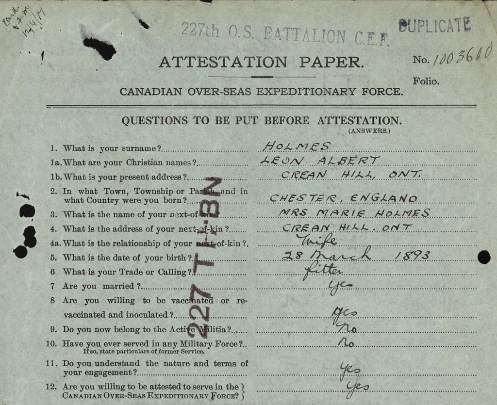 Less than a year later, World War One erupted, and, from 1917, Canadians were subject to conscription. However, Leon enlisted s a volunteer on 16th June 1916.
