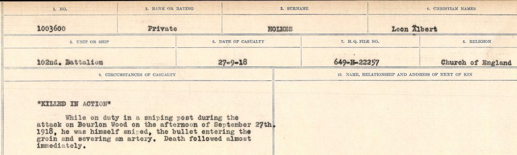 Leon died on 27th September 1918, during the latter weeks of World War One. His casualty report gives an unusually detailed report of his death from a sniper’s bullet.
